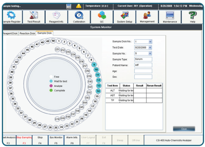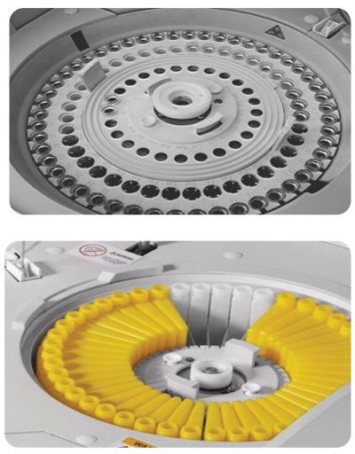 - 67 vị trí thuốc thử, trong đó có 1 vị trí chất tẩy, 66 vị trí thuốc thử đơn hoặc 33 vị trí thuốc thử kép. Mỗi vị trí thuốc thử có thể nạp botlle thuốc thử phổ biến 70ml, 20ml hoặc 100ml, toàn bộ đĩa có thể dễ dàng thay thế bằng tay.