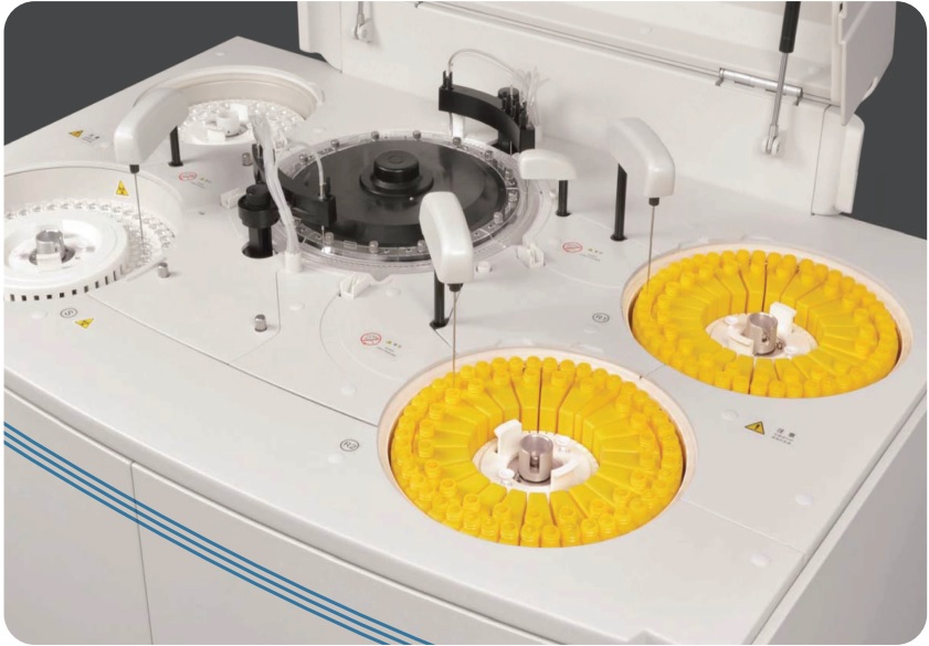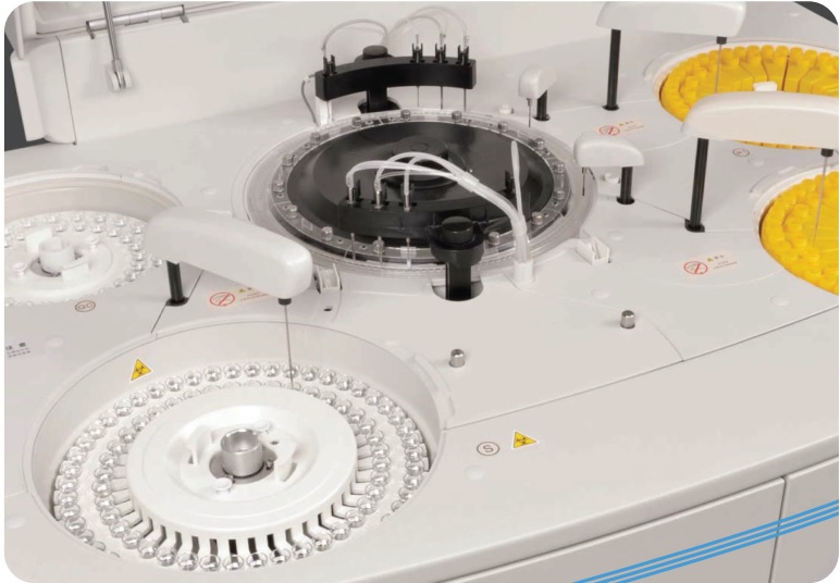 - Máy phân tích cảm nhận thể tích mẫu và thuốc thử còn lại và số lượng vật phẩm thử tự động và báo động khi mẫu và thuốc thử không đủ để đảm bảo phân tích liên tục.